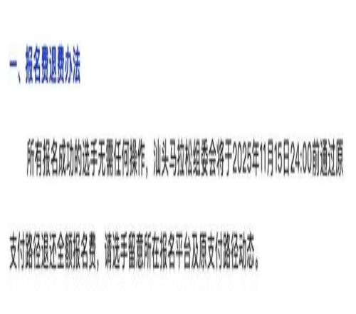 根据组委会安排,所有报名成功的选手无需进行任何操作,组委会将于2025年11月15日24:00前通过原支付路径退还全额报名费,请选手留意所在报名平台及原支付路径动态。