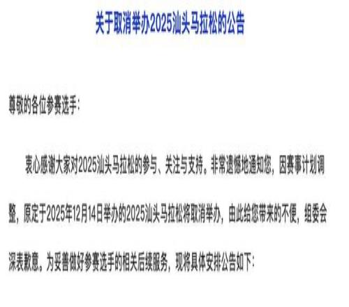 10月31日,“汕头马拉松”微信公众号发布《关于取消举办2025汕头马拉松的公告》称,因赛事计划调整,原定于12月14日举办的2025汕头马拉松将取消举办。
