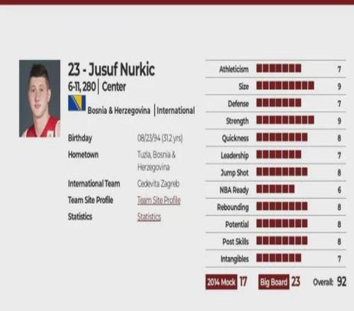 努尔基奇综合评分92分,选秀模板佩科维奇、帕楚里亚,都是非常典型的欧式中锋,小杨综合评分90分,努尔基奇在Athleticism(运动能力)Strength(力量)Quickness(速度)Jump Shot(跳投)Potential(潜力)方面都领先小杨一分,而在Size(尺寸)Defense(防守) Leadership(领导力)Rebounding(篮板)Post Skills(低位技术)方面和小杨平分,而小杨在NBA Ready(NBA准备)方面领先努尔基奇2分,Intangibles(无形资产)领先1分。