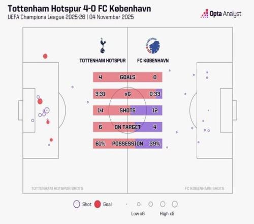 本场对阵哥本哈根,热刺全队合计打出3.31的预期进球值,是球队自2024年11月面对罗马(3.74)以来的最高预期进球数,这已经过去了58场比赛。