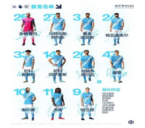 曼城首发阵容:唐纳鲁马、努内斯、迪亚斯、格瓦迪奥尔、奥赖利、尼科·冈萨雷斯、贝尔纳多·席尔瓦(队长)、福登、谢尔基、多库、哈兰德