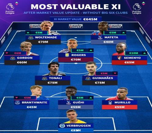 吉马良斯(纽卡斯尔联)7500万欧元(-500万欧元)、托纳利(纽卡斯尔联)7500万欧元、塞门约(伯恩茅斯)6500万欧元(+1000万欧元)、摩根-罗杰斯(阿斯顿维拉)7000万欧元(+500万欧元)、安东尼-戈登(纽卡斯尔联)6000万欧元(-600万欧元)